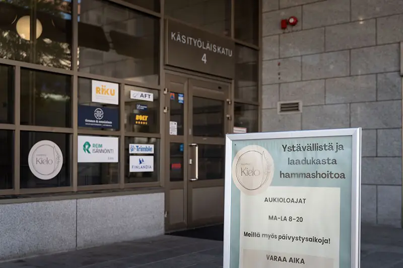 Pysäköinti: Autolla saapuessa voi pysäköidä välikadun p-alueelle, jossa on maksuton pysäköinti parkkikiekolla. Hammas Kielon sisäänkäynti 110 metriä parkkipaikalta. Muistathan pysäköintikiekon.